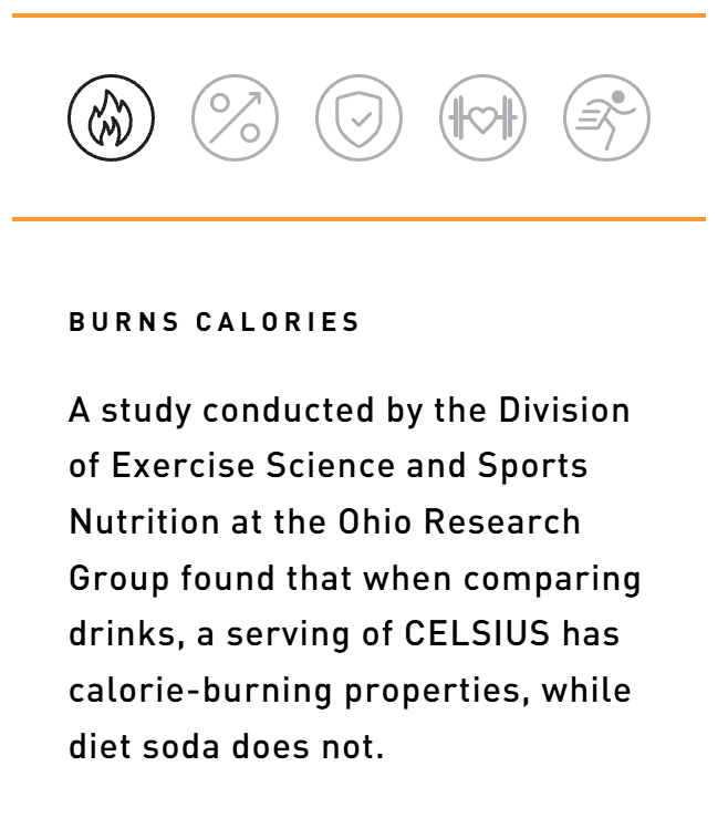 Stay active and energized all day long with CELSIUS by your side. We’re different from other energy drinks because we focus on movement. When combined with exercise, our formula is clinically proven to boost your metabolism and help you burn body fat. Whether you need an extra boost at the gym or a delicious pick-me-up to help you hustle through your workday, CELSIUS is here to help you stay active and focused on your goals. Made with only the best ingredients, CELSIUS has no artificial preservatives or flavors, no aspartame or high fructose corn syrup, and it’s very low in sodium..